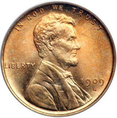 1909-S Lincoln Cent. PCGS graded MS-65 Red. Old Green Holder. A very persuasive lovely mint red gem. This blazing copper-bright beauty whose intense luster, sharp strike, and visual appeal are commensurate with the grade should attract a lot of bids. It bears none of the burdens of lesser quality specimens. The strike is strong, as expected for a first-year issue from the San Francisco Mint, with clear definition to the high points (PCGS # 2434) .