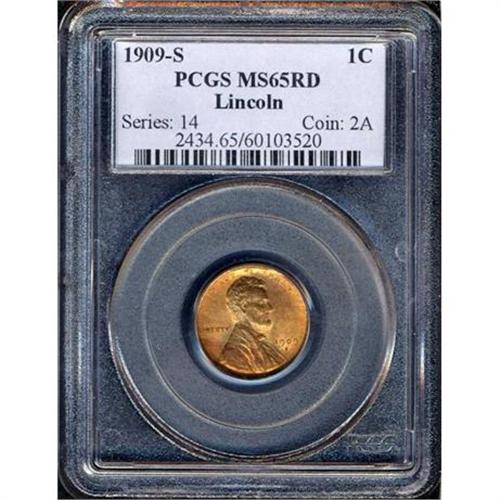 <b>1909-S Lincoln Cent. PCGS graded MS65 R.</b> A satiny gem with intense underlying cartwheel luster that explodes with vivid rose, peach, orange, and golden coppery iridescence. Absolutely eye-popping in all regards. Something perhaps worth pausing to study is the fact that all devices on this semi-key '09-S cent were struck with the usual and desirable consistency of this year, that is, sharply by the dies, which then left behind bold elements of detail throughout <b>(PCGS # 2434)</b>