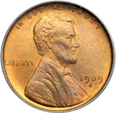 1909-S Lincoln Cent. VDB. PCGS graded MS-64 Red. Old Green Holder. A popular key date. The reverse exhibits strong eye appeal. Satiny matte surfaces explode with intense luster that collectors love to see on this low mintage rarity, the varying shades forming into a harmonious blend whose beauty lifts the spirits. Fully struck in all areas with pinpoint detailing on the tips of the Lincoln's curls as well as the bow tie, and all wheat lines on the reverse show with clarity. It'll be one of those happy days for the high bidder when he comes to claim this prize 1909-S VDB cent! (PCGS # 2428) .
