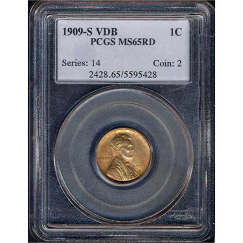 <b>1909-S Lincoln Cent. VDB. PCGS graded MS65 R.</b> A glowing fresh Gem that has rich coppery-gold color. Lustrous and immaculately preserved for this desirable Type. Struck with technical exactness throughout on Lincoln's hair and coat lapels, the wheat ears and kernels, with a clear V.D.B. along the lower rim of the reverse distinguishing this Type. One of only 484,000 pieces minted <b>(PCGS # 2428)</b>