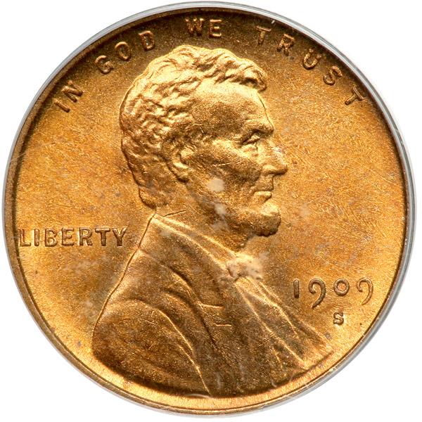 1909-S Lincoln Cent. VDB. PCGS graded MS-65 Red & Brown CAC Approved. Lots of mint red color. A serenly attractive Gem Mint State example and a Premium Quality coin for the grade. On the original models for this coin, Victor David Brenner had spelled out his name. Mint officials rejected this, so Brenner placed just his initials, VDB on the lower reverse. The White House quickly approved this, and forced the Mint to start production immediately. Naturally, the boldness of the initials worried officials, and soon the press was against the audacious signature. To attempt a compromise, the initial "B" was suggested for Lincoln's shoulder, but Mint Engraver Barber (who normally used his initial "B" to sign coins), vehemently rejected this. Soon Brenner's initials were dropped altogether, until Barber's death in late 1917. Starting in 1918, a small VDB was restored on the lower part of Lincoln's shoulder, where they remain to this day.