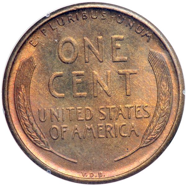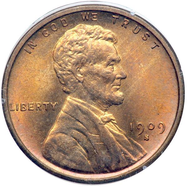 1909-S. VDB. PCGS graded MS-65 Red. Well struck with deep Mint Red colors. In a 1st generation holder. This coin is without question well struck for a first-year Lincoln Cent. And a gem! In fact, there are no areas of the design that are not fully detailed. What’s more, the surfaces are aglow with frosty textured, vibrant luster. Nothing at all stands between this attractive example and an even higher grade.
