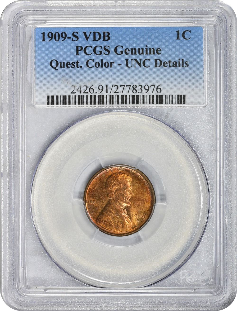 1909-S V.D.B. Genuine – Questionable Color – Uncirculated Details PCGS