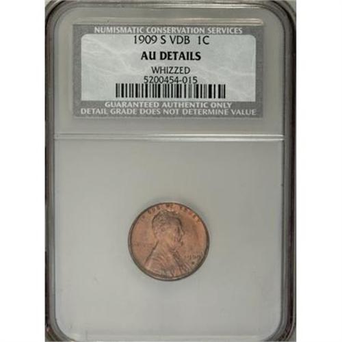 <B>1909-S VDB 1C --Whizzed--NCS. AU Details.</B></I> This VDB cent appears bright and satiny to the unaided eye. Thorough rotation beneath a loupe reveals cloudy patches of hairlines. The E in UNITED has a small spot.<BR><BR><B>Coin Engraver:</B> Victor D. Brenner<BR><BR><b>Shipping:</b> Coins & Currency (<a target="_blank" href="http://www.heritageauctions.com/common/shipping.php">view shipping information</a>)