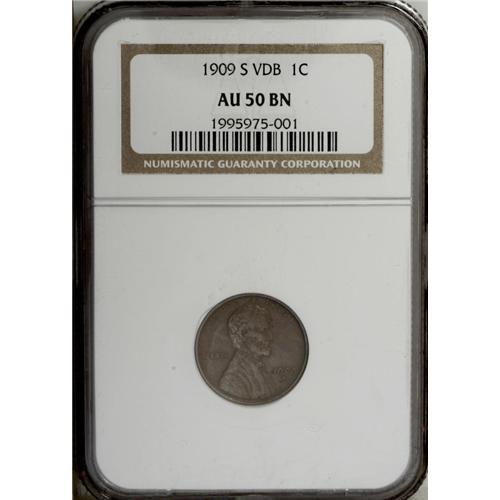 <B>1909-S VDB 1C AU50 NGC.</B></I> The lightly worn violet-brown surfaces have streaks of olive-gold on the reverse. A nicely struck example of this always sought-after issue.<BR><BR><b>Shipping:</b> Coin/Currency (<a target="_blank" href="http://www.heritageauctions.com/common/shipping.php">view shipping information</a>)