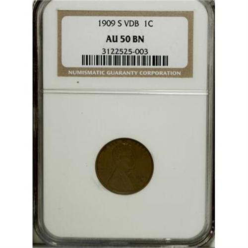 <B>1909-S VDB 1C AU50 NGC.</B></I> A lovely, lightly circulated example of this ever-popular Lincoln key, teak-brown with distinct lapis-blue and violet overtones. Light, even wear affects the well-defined portrait, but the surfaces show few marks of any significance.<BR><BR><B>Coin Engraver:</B> Victor D. Brenner<BR><BR><b>Shipping:</b> Coins & Currency (<a target="_blank" href="http://www.heritageauctions.com/common/shipping.php">view shipping information</a>)