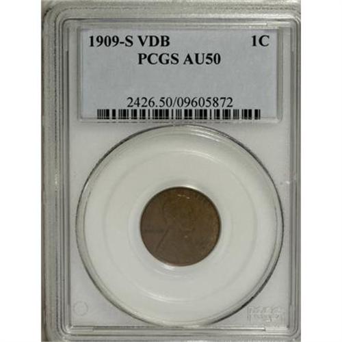 <B>1909-S VDB 1C AU50 PCGS.</B></I> Deep chocolate-brown surfaces show occasional undercurrents of gold and blue. A pleasingly detailed piece that shows only light, even wear and few marks overall.<BR><BR><B>Coin Engraver:</B> Victor D. Brenner<BR><BR><b>Shipping:</b> Coins & Currency (<a target="_blank" href="http://www.heritageauctions.com/common/shipping.php">view shipping information</a>)