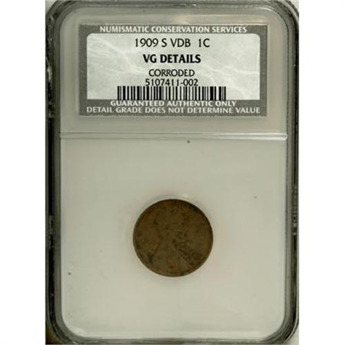 <B>1909-S VDB 1C --Corroded--NCS. VG Details.</B></I> NGC Census: (0/0). PCGS Population (0/0). Mintage: 484,000. (#2426)<BR><BR><B>Coin Engraver:</B> Victor D. Brenner<BR><BR><b>Shipping:</b> Coins & Currency (<a target="_blank" href="http://www.heritageauctions.com/common/shipping.php">view shipping information</a>\)