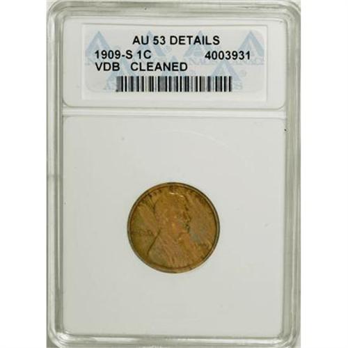 <B>1909-S VDB 1C --Cleaned--ANACS. AU53 Details.</B></I> A glossy key date cent with pleasing sharpness and bold VDB initials. The surfaces display streaky sea-green and orange hues. A lamination is retained from the cheekbone to the mouth with a tiny peeled section in the field above the chin.<BR><BR><B>Coin Engraver:</B> Victor D. Brenner<BR><BR><b>Shipping:</b> Coins & Currency (<a target="_blank" href="http://www.heritageauctions.com/common/shipping.php">view shipping information</a>)