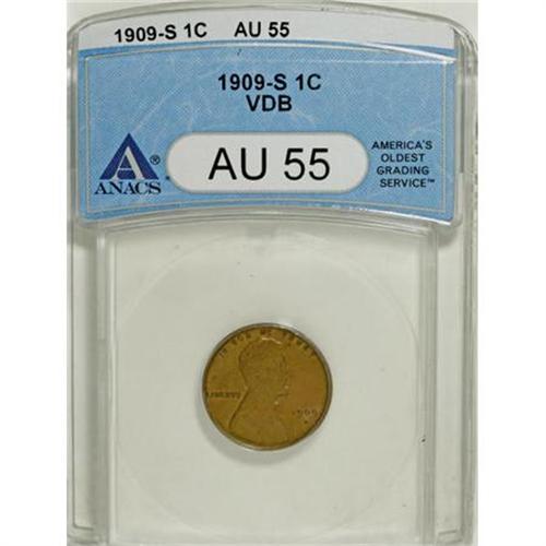<B>1909-S VDB 1C AU55 ANACS.</B></I> A well struck example of this prized first-year issue, predominantly copper-brown with a touch of orange at the left reverse. Light, even wear affects the highpoints of the otherwise pleasingly preserved devices.<BR><BR><B>Coin Engraver:</B> Victor D. Brenner<BR><BR><b>Shipping:</b> Coins & Currency (<a target="_blank" href="http://www.heritageauctions.com/common/shipping.php">view shipping information</a>)