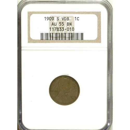 <B>1909-S VDB 1C AU55 NGC.</B></I> Lincoln has a hint of wear above the ear and on his cheekbone, but this well struck key date cent is smooth aside from a minor obverse rim depression at 5 o'clock.<BR><BR><b>Shipping:</b> Coins & Currency (<a target="_blank" href="http://www.heritageauctions.com/common/shipping.php">view shipping information</a>)