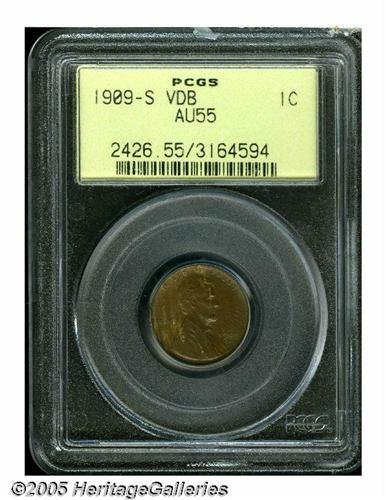 <B>1909-S VDB<1C> AU55 PCGS.</B></I> Probably the most well known of all 20th Century key dates. This example is endowed with warm golden-tan patina, and exhibits sharply defined design elements. A couple of minor marks occur on Lincoln's cheek, and a couple of more on the bottom of the reverse.