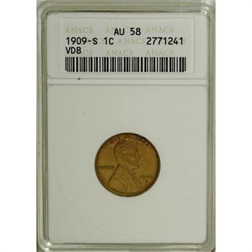 <B>1909-S VDB 1C AU58 ANACS.</B></I> A glossy and pleasing chocolate-brown specimen of this key date, with a touch of mint red still present. Well struck, with excellent detail on Lincoln's coat and all of the reverse devices. Only a touch of rub shows on Lincoln's cheek, and the initials V.D.B. are especially bold.<BR><BR><B>Coin Engraver:</B> Victor D. Brenner<BR><BR><b>Shipping:</b> Coins & Currency (<a target="_blank" href="http://www.heritageauctions.com/common/shipping.php">view shipping information</a>)