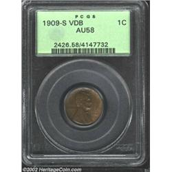 1909-S VDB 1C AU58 PCGS. This is a very attractive circulated representative of this important first-year Lincoln Cent. The otherwise medium brown obverse reveals streaks of tan color over the right side. Similar colors are seen on the reverse, but they are more mottled in distribution. Sharply defined overall with little evident rub. Important notice: We expect to be auctioning lots at the rate of 200-250 per hour. Sometimes eBay Premier live bid software cannot keep up with that pace, so we strongly recommend that you place a realistic proxy bid now as insurance to avoid disappointment. Also please note that all Heritage/CAA lots purchased through eBay Premier carry a 20% Buyer's Premium. Please make sure you read the Terms and Conditions.