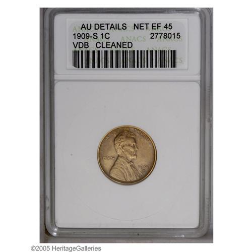 1909-S VDB 1C --Cleaned--ANACS. AU Details, Net XF45. A 1909-S VDB[1C]--Cleaned--ANACS. AU Details,