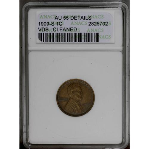 <B>1909-S VDB<1C>--Cleaned--ANACS. AU55 Details.</B></I> This sharp golden-brown key date cent has unabraded surfaces. A few specks of translucent brown reside are noted at 12 o'clock on the reverse. <BR><BR><B>Important notice:</B> Heritage usually auctions material at the rate of 200-250 lots per hour. On some occasions eBay Live bid software or the Internet may not be able to keep up with the pace of the auction. We recommend placing a realistic absentee bid now as insurance to avoid disappointment. Occasionally the auctioneer may eliminate or reject an eBay Live bid, and the auctioneer may also reopen a lot after the close of the eBay live bidding (usually because we missed an audience bid), and may reject your bid even if it shows you as the winning bidder. By bidding via eBay Live, you agree that Heritage may award the lot to another bidder at its sole discretion under the circumstances described above or any other reasonable circumstances. Since eBay bids are not shown to us until we open the lot on the floor, we treat those bids just like floor bids. In most cases the floor responds before the eBay bid is presented to us, due to Internet lag time, so for consistency we have made it a policy that floor bids are always considered first over tie eBay live bids. Also please note that all Heritage lots purchased through eBay Live carry a 20% Buyer's Premium. Please make sure you read the Terms and Conditions before you bid. This lot is being auctioned in conjunction with a live floor auction by Heritage Galleries & Auctioneers. All final auction and invoice information will be supplied by Heritage Galleries & Auctioneers, and all other information should be considered preliminary. Lot:587 <BR><BR><B>Winning Notification and Billing:</B> After the FINAL session in this auction is complete, Heritage will send e-mail and snail mail invoices. This process normally takes several days. All final auction and invoice information will be supplied by Heritage Galleries & Auctioneers, and all other information should be considered preliminary. <BR><BR>This auction will be conducted on a live auction floor and over the Internet through eBay Live. If you choose to place an absentee bid, please take a moment to <font color='#0000ff'><u><a href='http://pages.ebay.com/liveauctions/help/before/laabsentee.html'>learn how eBay Live absentee bidding works</a></u></font><font color='#000000'>