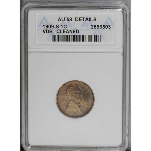 <B>1909-S VDB<1C>--Cleaned--ANACS. AU58 Details.</B></I> Minor friction is noted on the highpoints. The surfaces, which have disturbed luster from cleaning, have pinkish-gold and medium brown streaks with dark spots on each side.