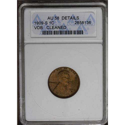 1909-S VDB 1C --Cleaned--ANACS. AU58 Details. The obver 1909-S VDB