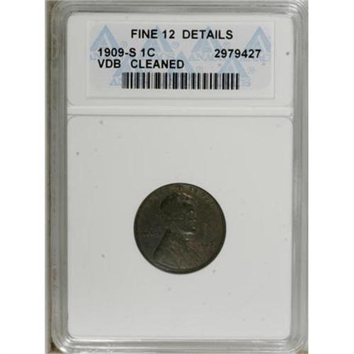 <B>1909-S VDB 1C --Cleaned--ANACS. Fine 12 Details.</B></I> NGC Census: (119/2165). PCGS Population (163/4005). Mintage: 484,000. Numismedia Wsl. Price for NGC/PCGS coin in F12: $680. (#2426)<BR><BR><b>Shipping:</b> Coins & Currency (<a target="_blank" href="http://www.heritageauctions.com/common/shipping.php">view shipping information</a>)