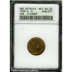 1909-S VDB 1C --Cleaned--ANACS. UNC Details, Net AU50 <B>1909-S VDB 1C --Cleaned--ANACS. UNC Details, Net AU50.</B></I> Streaky, variegated toning adorns each side of this well struck, unblemished example. The luster is muted, after an improper cleaning at some point in the past. <BR><BR><B>Important notice:</B> Heritage usually auctions material at the rate of 200-250 lots per hour. On some occasions eBay Live bid software or the Internet may not be able to keep up with the pace of the auction. We recommend placing a realistic absentee bid now as insurance to avoid disappointment. Occasionally the auctioneer may eliminate or reject an eBay Live bid, and the auctioneer may also reopen a lot after the close of the eBay live bidding (usually because we missed an audience bid), and may reject your bid even if it shows you as the winning bidder. By bidding via eBay Live, you agree that Heritage may award the lot to another bidder at its sole discretion under the circumstances described above or any other reasonable circumstances. Since eBay bids are not shown to us until we open the lot on the floor, we treat those bids just like floor bids. In most cases the floor responds before the eBay bid is presented to us, due to Internet lag time, so for consistency we have made it a policy that floor bids are always considered first over tie eBay live bids. Also please note that all Heritage lots purchased through eBay Live carry a 20% Buyer's Premium. Please make sure you read the Terms and Conditions before you bid. This lot is being auctioned in conjunction with a live floor auction by Heritage Galleries & Auctioneers. All final auction and invoice information will be supplied by Heritage Galleries & Auctioneers, and all other information should be considered preliminary. Lot:5198