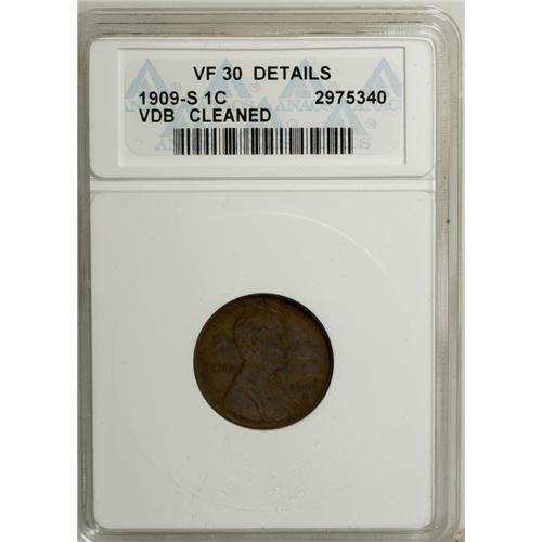 <B>1909-S VDB 1C --Cleaned--ANACS. VF30 Details.</B></I> Somewhat muted but nicely detailed, with a mild woodgrain effect noted on the reverse. A couple of shallow abrasions are located near Lincoln's eye and temple areas. An affordable example of this famous key date.<BR><BR><b>Shipping:</b> Coins & Currency (<a target="_blank" href="http://www.heritageauctions.com/common/shipping.php">view shipping information</a>)