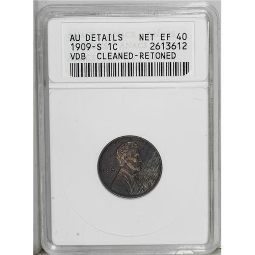 <B>1909-S VDB<1C>--Cleaned, Retoned--ANACS. AU Details, Net XF40.</B></I> A harshly cleaned and artificially retoned example of this ever-popular issue. The surfaces are primarily a deep charcoal-brown on both sides. An abrasion is noticeable in the upper left obverse field. An affordable representative of the nominal key date to the Lincoln cent series.