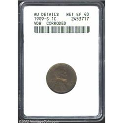 1909-S VDB 1C--Corroded--ANACS. AU Details, Net XF 40. A sharp, well centered example of this classic Lincoln cent. Some discoloration is seen, particularly on the reverse, but this hardly detracts. Only 484,000 pieces were struck at San Francisco with the prominent VDB on the reverse. Important notice: We expect to be auctioning lots at the rate of 200-250 per hour. Sometimes eBay Premier live bid software cannot keep up with that pace, so we strongly recommend that you place a realistic proxy bid now as insurance to avoid disappointment. Also please note that all Heritage/CAA lots purchased through eBay Premier carry a 20% Buyer's Premium. Please make sure you read the Terms and Conditions.