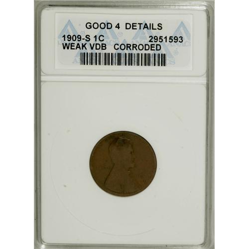 <B>1909-S VDB 1C Weak VDB--Corroded--ANACS. Good 4 Details.</B></I> NGC Census: (14/3431). PCGS Population (9/4253). Mintage: 484,000. Numismedia Wsl. Price: $450. (#2426)<BR><BR><b>Shipping:</b> Coins & Currency (<a target="_blank" href="http://www.heritageauctions.com/common/shipping.php">view shipping information</a>)