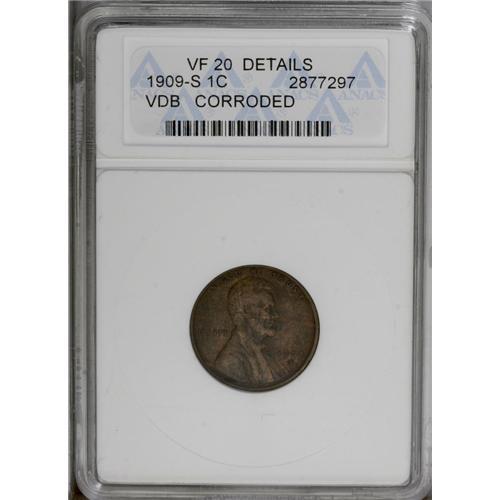 <B>1909-S VDB<1C>--Corroded--ANACS. VF20 Details.</B></I> The once-cleaned surfaces are somewhat porous and subdued. Otherwise, a well detailed and affordable example.