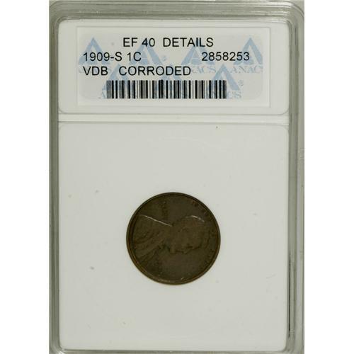 <B>1909-S VDB 1C --Corroded--ANACS. XF40 Details.</B></I> A minutely granular piece with medium brown toning and bold design details. Glimpses of luster emerge when the key date cent is rotated beneath a light.<BR><BR><b>Shipping:</b> Coin/Currency (<a target="_blank" href="http://www.heritageauctions.com/common/shipping.php">view shipping information</a>)