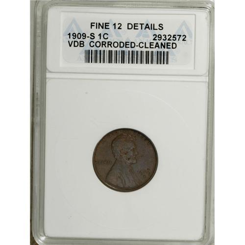 <B>1909-S VDB 1C --Corroded, Cleaned--ANACS. Fine 12 Details.</B></I> A glossy piece with iridescent powder-blue and ruby toning. The reverse has several pinpoint dark specks, and the reverse rim shows a depression at 10 o'clock. A coveted key date.<BR><BR><b>Shipping:</b> Coins & Currency (<a target="_blank" href="http://www.heritageauctions.com/common/shipping.php">view shipping information</a>)