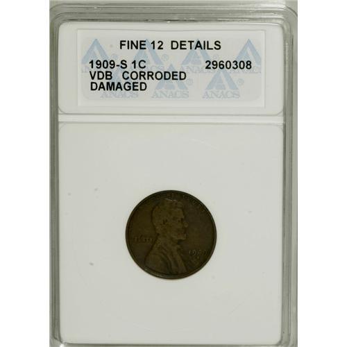 <B>1909-S VDB 1C --Corroded, Damaged--ANACS. Fine 12 Details.</B></I> A reddish-brown example with a couple of unimportant spots and a number of subdued, brief scratches. The VDB initials are bold.<BR><BR><b>Shipping:</b> Coins & Currency (<a target="_blank" href="http://www.heritageauctions.com/common/shipping.php">view shipping information</a>)