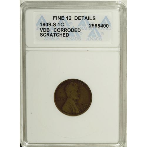 <B>1909-S VDB 1C --Corroded, Scratched--ANACS. Fine 12 Details.</B></I> NGC Census: (263/3100). PCGS Population (161/3954). Mintage: 484,000. Numismedia Wsl. Price for NGC/PCGS coin in F12: $660. (#2426)<BR><BR><b>Shipping:</b> Coins & Currency (<a target="_blank" href="http://www.heritageauctions.com/common/shipping.php">view shipping information</a>)