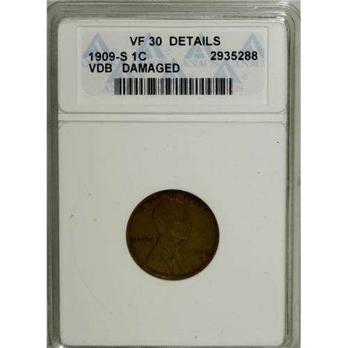 <B>1909-S VDB 1C --Damaged--ANACS. VF30 Details.</B></I> Well detailed with even wear and attractive mahogany-brown coloration. A few wisps of dark verdigris are noted on each side. Several deep marks are noted over ONE, on the upper reverse, and two or three more are observed along the lower left obverse periphery, between 6 o'clock and 9 o'clock. An affordable example of this highly sought-after key date.<BR><BR><b>Shipping:</b> Coins & Currency (<a target="_blank" href="http://www.heritageauctions.com/common/shipping.php">view shipping information</a>)