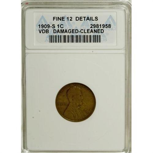 <B>1909-S VDB 1C --Damaged, Cleaned--ANACS. Fine 12 Details.</B></I> Cleaned long ago, the surfaces have taken on an even brown appearance that largely conceals the hairlines. The Damaged disclaimer is from a scratch below the date and a few pinprick marks on the lower reverse. <BR><BR><b>Shipping:</b> Coins & Currency (<a target="_blank" href="http://www.heritageauctions.com/common/shipping.php">view shipping information</a>)