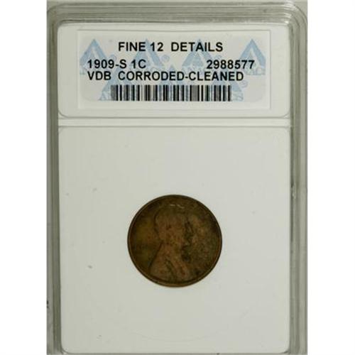 <B>1909-S VDB 1C --Cleaned, Corroded--ANACS. Fine 12 Details.</B></I> NGC Census: (119/2165). PCGS Population (163/4005). Mintage: 484,000. Numismedia Wsl. Price for NGC/PCGS coin in F12: $720. (#2426)<BR><BR><B>Coin Engraver:</B> Victor D. Brenner<BR><BR><b>Shipping:</b> Coins & Currency (<a target="_blank" href="http://www.heritageauctions.com/common/shipping.php">view shipping information</a>\)