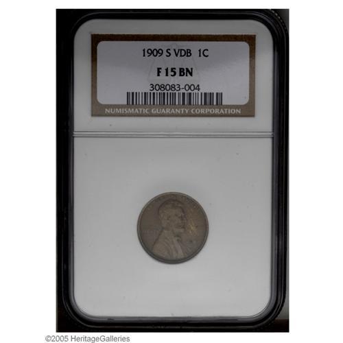 1909-S VDB 1C Fine 15 NGC. A circulated golden-brown e 1909-S VDB[1C] Fine 15 NGC.
