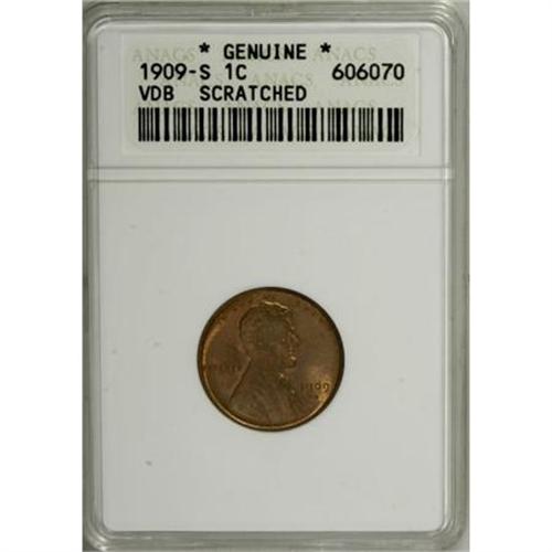 <B>1909-S VDB 1C --Scratched--ANACS. MS60 Details.</B></I> This is an Uncirculated example with full mint luster and a friction-free portrait. The fire-red and lime surfaces appear problem-free at first glance, then a small number of staple scratches are found on the lower reverse.<BR><BR><B>Coin Engraver:</B> Victor D. Brenner<BR><BR><b>Shipping:</b> Coins & Currency (<a target="_blank" href="http://www.heritageauctions.com/common/shipping.php">view shipping information</a>)