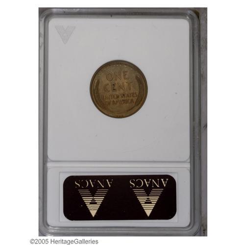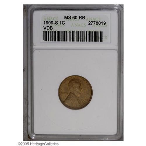<B>1909-S VDB<1C> MS60 Red and Brown ANACS.</B></I> Blended orange-gold and lilac colors. At first glance, this sharply struck key date Cent appears to merit a much higher grade, but the reverse has some build up near the central legends and a curved mark, perhaps from a mechanical coin counter, affects the upper left wheat ear and the base of E PLURIBUS UNUM.