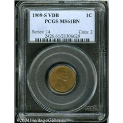 1909-S VDB 1C MS61 Brown PCGS. An affordable Mint <B>1909-S VDB 1C MS61 Brown PCGS.</B></I> An affordable Mint Sate example of this popular key date cent. Medium brown color overall with hints of golden patina in the protected areas. <BR><BR><B>Important notice:</B> Heritage usually auctions material at the rate of 200-250 lots per hour. On some occasions eBay Live bid software or the Internet may not be able to keep up with the pace of the auction. We recommend placing a realistic absentee bid now as insurance to avoid disappointment. Occasionally the auctioneer may eliminate or reject an eBay Live bid, and the auctioneer may also reopen a lot after the close of the eBay live bidding (usually because we missed an audience bid), and may reject your bid even if it shows you as the winning bidder. By bidding via eBay Live, you agree that Heritage may award the lot to another bidder at its sole discretion under the circumstances described above or any other reasonable circumstances. Since eBay bids are not shown to us until we open the lot on the floor, we treat those bids just like floor bids. In most cases the floor responds before the eBay bid is presented to us, due to Internet lag time, so for consistency we have made it a policy that floor bids are always considered first over tie eBay live bids. Also please note that all Heritage lots purchased through eBay Live carry a 20% Buyer's Premium. Please make sure you read the Terms and Conditions before you bid. This lot is being auctioned in conjunction with a live floor auction by Heritage Galleries & Auctioneers. All final auction and invoice information will be supplied by Heritage Galleries & Auctioneers, and all other information should be considered preliminary. Lot:5199