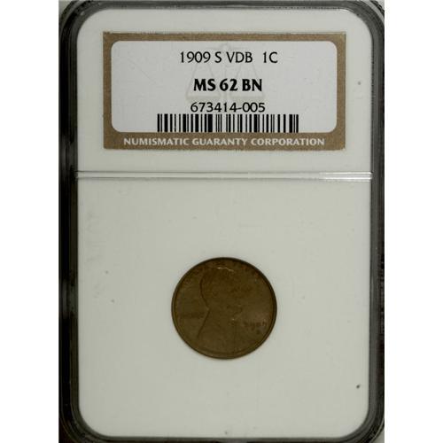 <B>1909-S VDB 1C MS62 Brown NGC.</B></I> Medium-brown with hints of violet and ruby on each side. This key-date representative is appealing despite the minor highpoint softness and abrasions exhibited on each side.<BR><BR><b>Shipping:</b> Coins & Currency (<a target="_blank" href="http://www.heritageauctions.com/common/shipping.php">view shipping information</a>)
