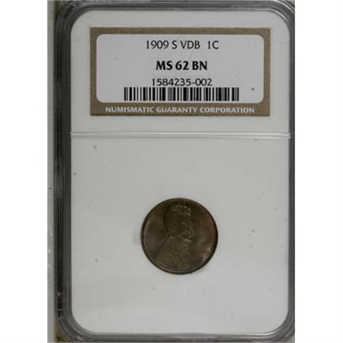 <B>1909-S VDB 1C MS62 Brown NGC.</B></I> Crisply struck with surprisingly strong eye appeal for the grade assigned. Cherrywood surfaces show occasional lavender and violet accents on the obverse, with similar colors and copper-gold on the reverse.<BR><BR><B>Coin Engraver:</B> Victor D. Brenner<BR><BR><b>Shipping:</b> Coins & Currency (<a target="_blank" href="http://www.heritageauctions.com/common/shipping.php">view shipping information</a>)