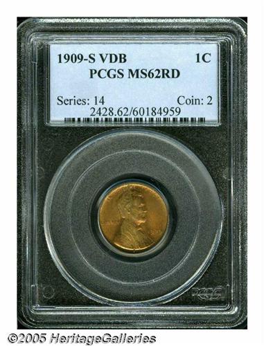 <B>1909-S VDB<1C> MS62 Red PCGS.</B></I> Muted orange color with light olive toning. The obverse has some minor flyspecks along with a couple streaks of darker color, limiting the grade of this example.
