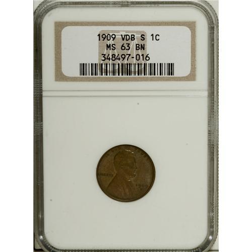 <B>1909-S VDB 1C MS63 Brown NGC.</B></I> Lime and chocolate-brown toning alternate across this satiny and boldly struck series key. Thorough evaluation locates a couple of faint field marks on the reverse.<BR><BR><b>Shipping:</b> Coins & Currency (<a target="_blank" href="http://www.heritageauctions.com/common/shipping.php">view shipping information</a>)