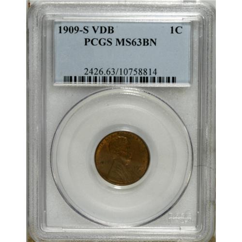 <B>1909-S VDB 1C MS63 Brown PCGS.</B></I> This pleasing key date example is sharply struck, with golden luster that peeks through reddish-brown and tan coloration. Only a couple of tiny nicks are observed on each side of this Select Mint State cent, and flyspecks are likewise minimal.<BR><BR><b>Shipping:</b> Coins & Currency (<a target="_blank" href="http://www.heritageauctions.com/common/shipping.php">view shipping information</a>)