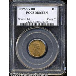 <B>1909-S VDB<1C> MS63 Brown PCGS.</B></I> A dusky olive-brown representative with hints of lilac patina on the highpoints. Crisply struck, as is usual for the variety, and with smooth, undisturbed surfaces. This lovely key date Cent would be the standout of many advanced Lincoln Cent collections. <BR><BR><B>Important notice:</B> Heritage usually auctions material at the rate of 200-250 lots per hour. On some occasions eBay Live bid software or the Internet may not be able to keep up with the pace of the auction. We recommend placing a realistic absentee bid now as insurance to avoid disappointment. Occasionally the auctioneer may eliminate or reject an eBay Live bid, and the auctioneer may also reopen a lot after the close of the eBay live bidding (usually because we missed an audience bid), and may reject your bid even if it shows you as the winning bidder. By bidding via eBay Live, you agree that Heritage may award the lot to another bidder at its sole discretion under the circumstances described above or any other reasonable circumstances. Since eBay bids are not shown to us until we open the lot on the floor, we treat those bids just like floor bids. In most cases the floor responds before the eBay bid is presented to us, due to Internet lag time, so for consistency we have made it a policy that floor bids are always considered first over tie eBay live bids. Also please note that all Heritage lots purchased through eBay Live carry a 20% Buyer's Premium. Please make sure you read the Terms and Conditions before you bid. </span></font></tr></table></td></tr></table>