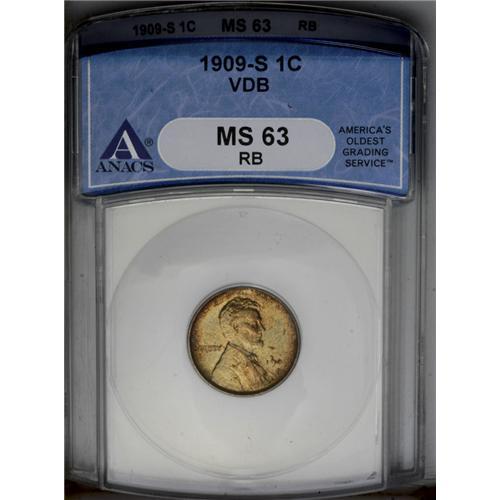 <B>1909-S VDB<1C> MS63 Red and Brown ANACS.</B></I> Time has faded the original mint red to a pleasing orange-mahogany. Most details are struck up well on this ultimate Lincoln cent key date.<BR><I>Ex: T.D. Walsh Collection (Stack's, 5/50), lot 2.</B></I><BR><I>From The Redfjord Collection.</B></I>