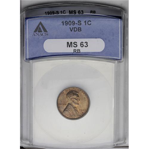 <B>1909-S VDB<1C> MS63 Red and Brown ANACS.</B></I> Well struck and highly lustrous, with bright, fine-grain surfaces that display a handful of wispy marks and a moderate number of grade-limiting flyspecks on each side. The rich coloration is more red than brown.