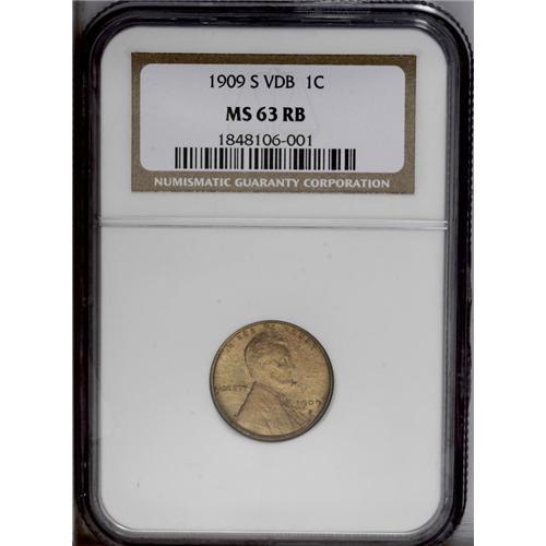 <B>1909-S VDB<1C> MS63 Red and Brown NGC.</B></I> Generally well struck, if typically weak on Lincoln's beard details, with a coating of speckled russet patina over golden-tan obverse and reverse surfaces. Lustrous and carefully preserved, with nary a distracting blemish to be found on either side. A few flyspecks limit the grade of this key date Lincoln cent.