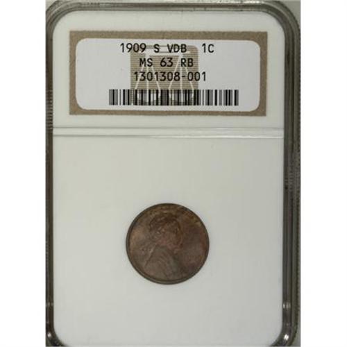 <B>1909-S VDB 1C MS63 Red and Brown NGC.</B></I> Gold-tan luster adorns both sides of this Select, popular cent, and a well directed strike brings out sharp definition on the design elements. A few light toning flecks are noted on each side.<BR><BR><B>Coin Engraver:</B> Victor D. Brenner<BR><BR><b>Shipping:</b> Coins & Currency (<a target="_blank" href="http://www.heritageauctions.com/common/shipping.php">view shipping information</a>)